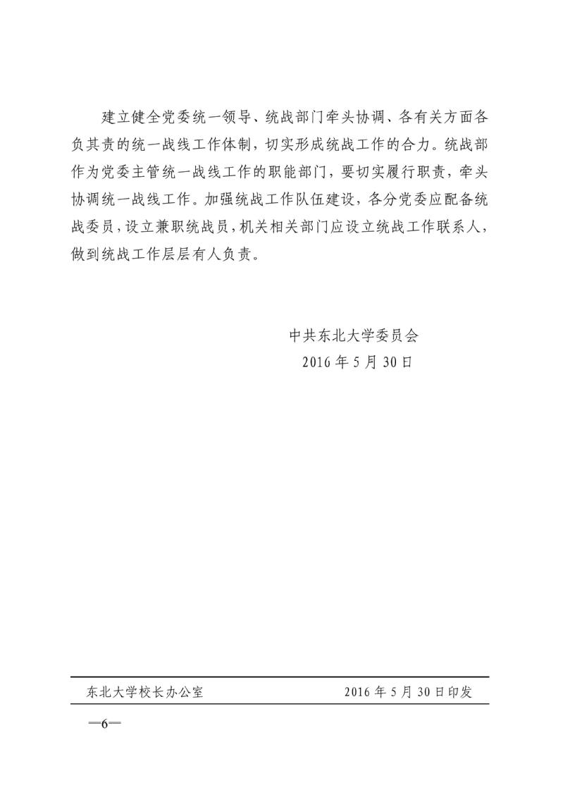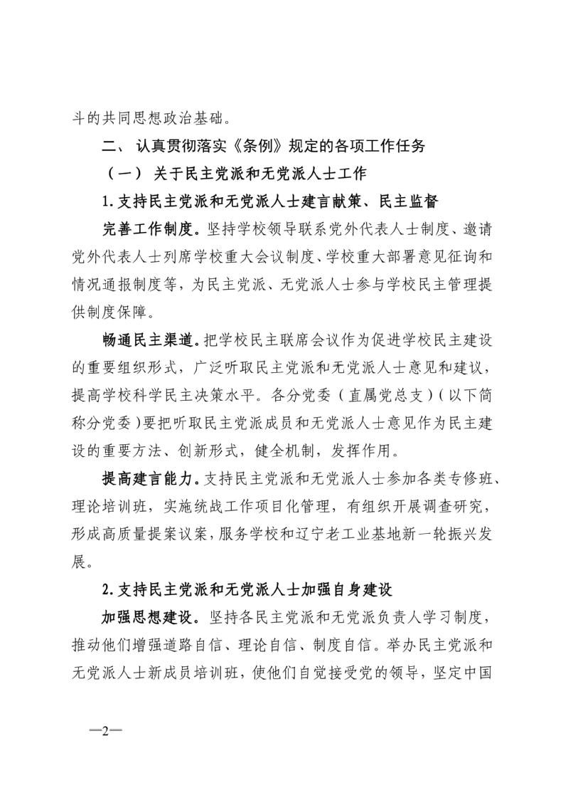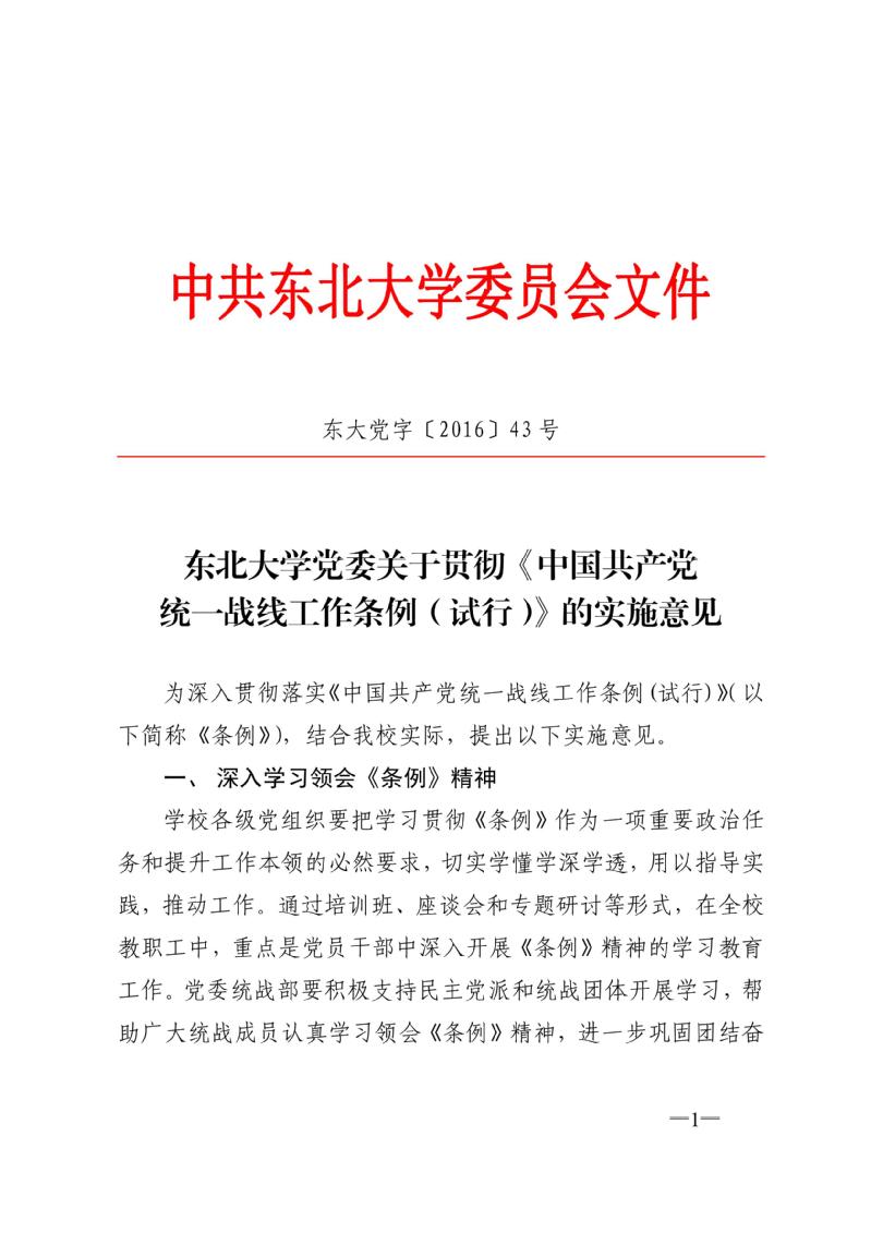 东北大学党委关于贯彻《中国共产党统一战线工作条例(试行)》的实施意见